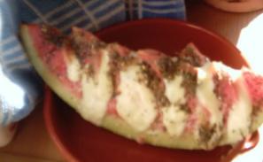 1. Pour vinegar and salt over the red parts of the watermelon. Let it stay for a while. Make cuts from the upper part of the melon to the skin, but don’t cut the skin. Chop the mozzarella in discs, place these discs in the cuts you have made. Spice up with thyme, ginger and maw-seed.
